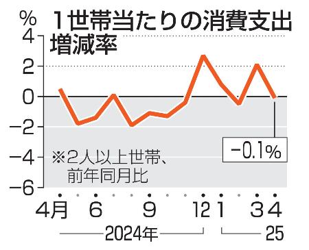 総務省が6日発表した4月の家計調査は、1世帯(2人以上)当たりの消費支出が32万5717円となり、物価変動の影響を除いた実質で前年同月比0・1%減だった。マイナスは2カ月ぶり。衣服や医療サービスなどへの支出が減少した。価格上昇の一服を受け野菜類をはじめ食料への支出は増加した。