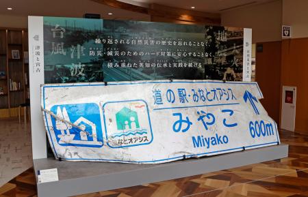 館内には、東日本大震災の津波でねじまがった道の駅の案内標識(幅3・5メートル、高さ1・1メートル)や津波が襲った午後3時24分で止まった時計が並ぶ。田老地区の「万里の長城」と呼ばれた巨大防潮堤の歴史や、明治三陸地震(1896年)や昭和三陸地震(1933年)の被害と復興についても常設展示している。