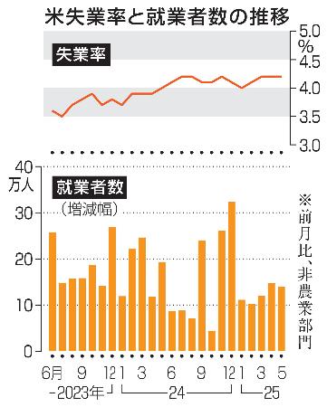 【ワシントン共同】米労働省が6日発表した5月の雇用統計(速報、季節調整済み)によると、景気動向を敏感に示す非農業部門の就業者数は前月から13万9千人増えた。13万人程度の増加を見込んだ市場予想を上回った。失業率は4・2%と前月から横ばいだった。