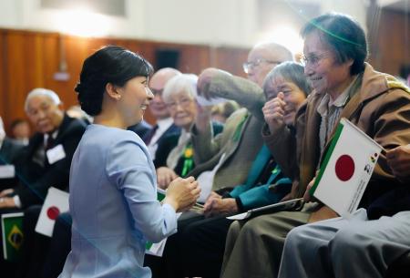 会場に到着した際、地元の小中学生約250人が両国の国旗を振って歓迎し、佳子さまは笑顔でハイタッチした。式典後、高齢の日系人に声をかけて回った。
