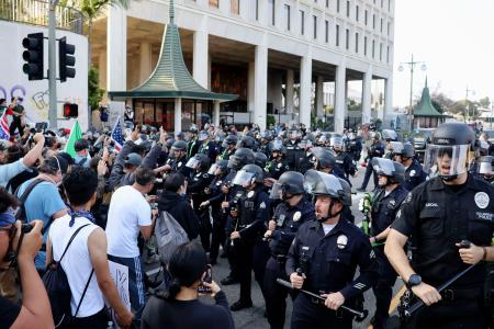 【ロサンゼルス共同】警察隊が突然、デモ参加者との距離を詰め、逃げ惑う背中を追いゴム弾を放った。米ロサンゼルスで9日も続いた移民摘発への抗議活動。発砲音が鳴り響く中、参加者は退きながらも「平和な訴えだ」と声をからした。移民の親を持つ参加者は「私たちは害悪ではない」と排除に反発し、海兵隊派遣で事態が悪化しかねないと案じた。