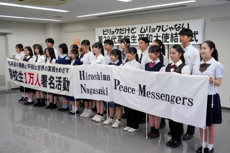 核兵器廃絶を国内外で訴える28代目の「高校生平和大使」の結団式が15日、広島市で開かれた。18都道府県から選ばれた24人が集まり「被爆80年という大きな節目を迎え、世界的に関心が高まっている。平和な世界の実現に向け、全国の仲間と活動に取り組む」と決意を表明した。