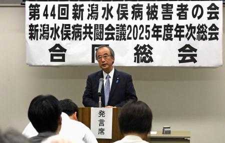 新潟水俣病の被害者らでつくる2団体が15日、新潟市で合同総会を開き、今後の活動方針を決めた。新潟水俣病が公式確認された5月31日に例年開催予定の式典に、環境相と原因企業の社長が毎年出席するよう求めることを確認した。