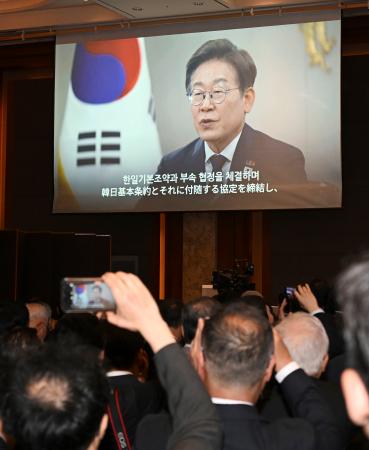 【ソウル共同】在韓日本大使館は16日、日韓国交正常化60周年を記念するレセプションをソウルで開いた。李在明大統領が「韓日関係が安定的に未来志向で発展することを願う」とするビデオメッセージを送った。4日に大統領に就任した李氏は、日本との連携強化に意欲を示している。