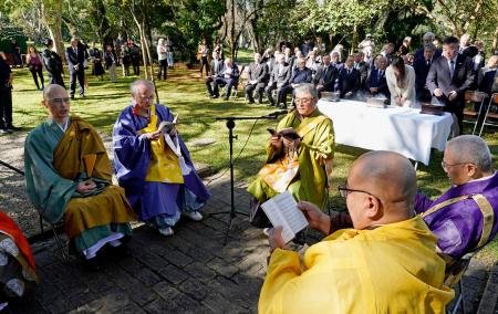 【サンパウロ共同】1908年に日本からの最初の移民を乗せた笠戸丸がブラジルのサントス港に到着したことから「日本移民の日」とされる18日、ブラジルの最大都市サンパウロにある開拓先没者慰霊碑前で法要が営まれた。