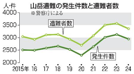 2024年に発生した山岳遭難は2946件(前年比180件減)、遭難者は3357人(211人減)で、いずれも統計の残る1961年以降で3番目に多かったことが19日、警察庁のまとめで分かった。死者・行方不明者は300人(35人減)だった。このうち訪日外国人の遭難は99件、遭難者は135人で、いずれも統計を始めた18年以降2番目に多かった。警察庁は、無理のない登山計画や登山届の提出などを呼びかけている。
