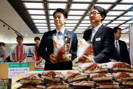 小泉進次郎農相は23日、JR東日本による東京駅での2024年産銘柄米の販売会を視察した。JR東は事前予約した人を対象に、秋田新幹線でこの日輸送した「あきたこまち」を5キロ当たり税込み3870円で引き渡す。政府はコメ全体の店頭価格を早期に3千円台にするとの目標を掲げており、銘柄米を安く販売する民間の取り組みをアピールした。