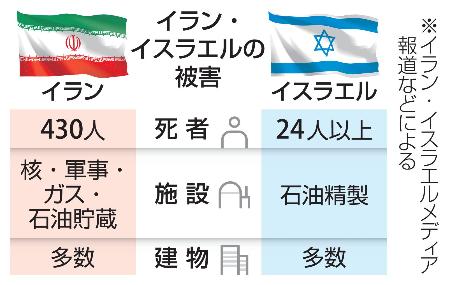 13日のイスラエルによる先制攻撃以降、イラン側は430人、イスラエル側は24人以上が死亡し、双方の死者はこれまでに450人を超えた。イランでは核関連施設や軍事施設のほかガス施設、石油貯蔵施設が攻撃された。イスラエルでも石油精製所が閉鎖に追い込まれた。両国の建物は多数破壊され、被害は甚大だ。