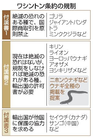 ワシントン条約では、「付属書1」は商業目的の国際取引は禁止、「付属書2」は取引は可能だが輸出国の許可書が必要になる。EUはニホンウナギやアメリカウナギ、東南アジア産のビカーラ種など亜種を含めた全19種類を付属書2の対象とする方針。生きたシラスウナギや成魚だけでなく、加工品も対象になる。
