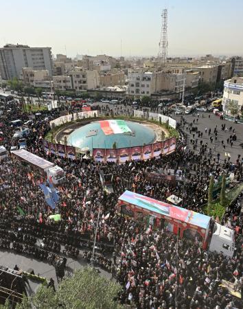 通りは黒い服で身を包んだ人であふれ、国旗がはためいた。殺害された軍のバゲリ参謀総長や革命防衛隊トップのサラミ司令官の肖像写真を手に涙を流す人も。ひつぎを乗せたトラックに多くの人が群がり、騒然とする場面もあった。自動小銃を持った兵士や警察官がそこかしこに配置され、厳戒態勢が敷かれた。