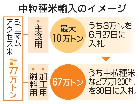 国はミニマムアクセスで年約77万トンを受け入れており、主食用は最大10万トン。このうち3万トンの入札を27日に実施した。今回の入札は残る67万トン分の一部で、国産米の価格に影響しないよう加工向けなどに用途を絞っている。