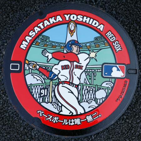 米大リーグ・レッドソックスの吉田正尚選手のイラストが描かれたマンホールのふたが、出身地・福井市の野球場「福井フェニックススタジアム」の正面出入り口前に設置されたことを記念したセレモニーが30日、同スタジアムで開かれた。