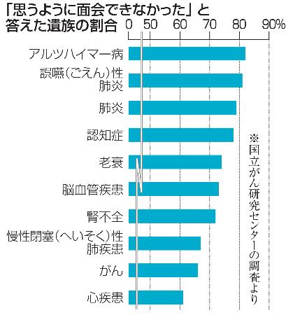 新型コロナウイルス禍の2021年に病気で亡くなった人の遺族の6割超が「思うように面会できなかった」と感じているとの調査結果を、国立がん研究センターが3日、公表した。人生の最終段階にあった患者と家族に与えた新型コロナの影響が浮き彫りになった。がんでは面会制限を避けて自宅療養を選んだ割合が他の疾患より高く、望んだ場所で過ごせたとの声も多かった。
