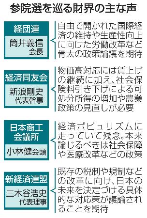 3日に公示された参院選を巡り、財界からは各党の主張が給付や減税といった目先の物価高対策に集中していることを懸念する声が上がった。賃金引き上げや社会保障制度改革、農業政策など中長期的な課題についての政策論争を求めた。