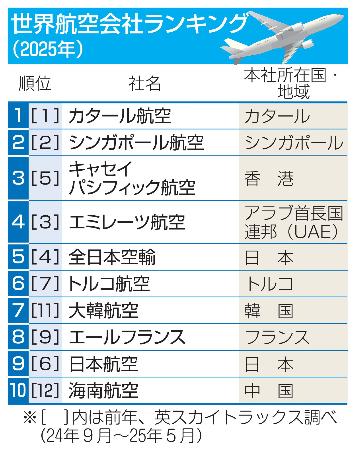 英国の航空関連調査会社「スカイトラックス」がこのほど発表した2025年の世界航空会社ランキングで、全日本空輸が5位、日本航空は9位に入った。乗客の満足度を反映したもの。業界の競争激化を背景に前年から全日空が一つ、日航は三つ順位を落としたが、ともに世界トップ10に食い込んだ。