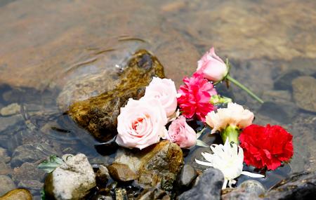 球磨村の神照寺では追悼法要が開かれた。参列者は川辺川に菊やカーネーションなどを投げ入れる「花おくり」を行い、犠牲者の鎮魂を祈った。