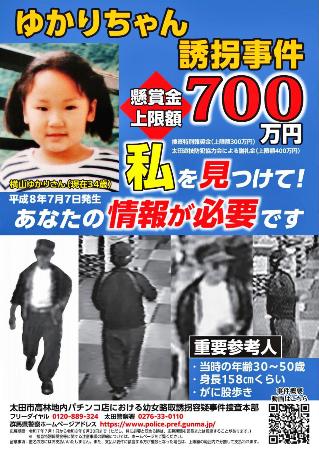 ゆかりちゃんは1996年7月7日、家族と来店したパチンコ店で行方不明になった。店内の防犯カメラには、ゆかりちゃんに話しかける不審な男が写っており、県警は重要参考人として捜査している。
