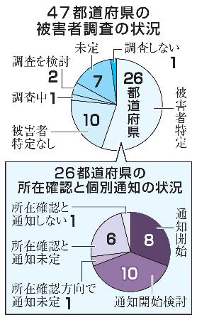 旧優生保護法(1948~96年)下で障害者らが不妊手術を強いられた問題で、青森や福岡など8県が、独自に所在を確認できた被害者に補償対象であると知らせる「個別通知」を行っていることが6日、共同通信の都道府県アンケートで分かった。10都道県は通知開始を検討中と答え、残る29府県は未定などとしている。申請は被害件数の1%程度にとどまっており、被害者掘り起こしの取り組みを広げていくことが課題となる。