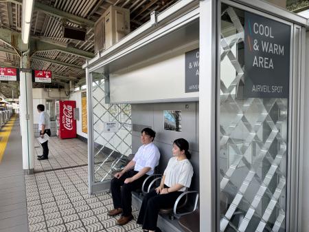 パナソニックは7日、大阪市港区の大阪メトロ朝潮橋駅のホームで、扉がなくても涼しい開放型の待合ブースを報道陣に公開した。冷気や暖気を制御し、一般的な待合室と同様の快適性を実現。猛暑による熱中症対策として狭いホームにも設置可能で、10月まで実証実験に取り組む。
