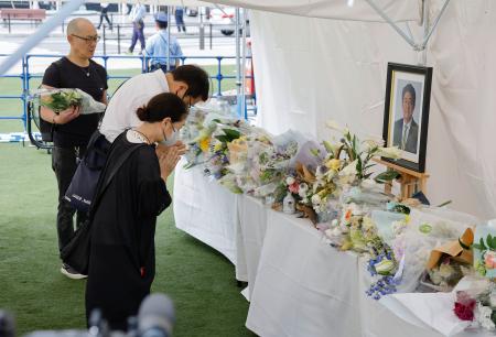 事件は2022年7月8日午前11時半ごろ発生。近鉄大和西大寺駅前の現場には今年も献花台が設置され、多くの花々と共に安倍氏の遺影が置かれた。発生時刻には居合わせた人たちが黙とうした。近くには手荷物検査への協力を呼びかける張り紙も。参院選のポスター掲示板には候補者の顔が並び、各陣営のスタッフがチラシを配ったり選挙カーが走り回ったりしていた。