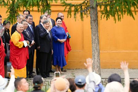 【ウランバートル共同】モンゴル訪問中の天皇陛下は10日、首都ウランバートルで国内最大規模の仏教寺院「ガンダン寺」を訪れ、金色に輝く高さ約25メートルの開眼観音像などを視察された。