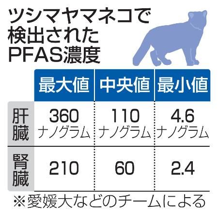 ツシマヤマネコは長崎県の離島・対馬に生息。愛媛大先端研究院の野見山桂准教授は、PFAS汚染は各地に広まっており、他の野生動物にも影響を与えている恐れがあると指摘。「ツシマヤマネコのみならず、野生動物の保護のために全国的な調査と汚染源の特定が必要だ」と話した。