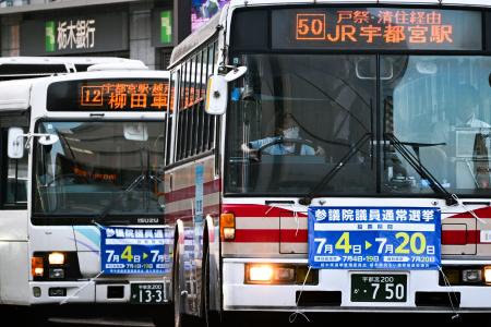 宇都宮市を走るバス前面に「7月4日~7月20日」の幕が張られた。栃木県選管は、これまでの選挙では投票日を示すだけだったポスターや動画などで、期日前と不在者投票を含む「投票期間」を宣伝している。