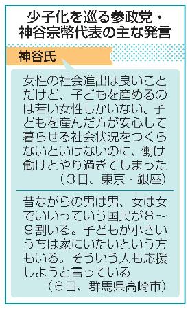 神谷氏は3日、東京・銀座での演説で「女性の社会進出は良いことだけど、子どもを産めるのは若い女性しかない」と言及。働く若い女性が増えたことで少子化が進んだとし「男女共同参画は間違えていた」と言い切った。政府の男女共同参画基本計画が念頭にあるとみられ、群馬県高崎市での演説でも「やり方を変えよう」と訴えた。