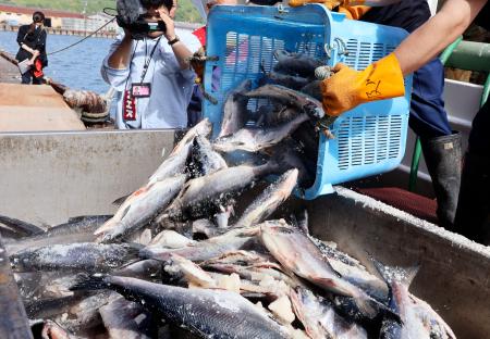 ロシアの排他的経済水域(EEZ)で日ロの政府間交渉に基づきサケ・マス漁の試験操業を実施した「第68善龍丸」(富山県鮭鱒漁協所属、199トン)が14日、北海道根室市の花咲港に戻り水揚げした。漁獲量は約66トンで、今年の割当量125トンの半分ほどにとどまった。