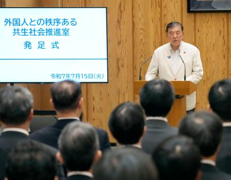 政府は15日、外国人に関連する施策を担う事務局組織「外国人との秩序ある共生社会推進室」の発足式を首相官邸で開いた。石破茂首相は「ルールを守らない人への厳格な対応や外国人を巡る現下の情勢に十分に対応できていない制度の見直しは政府として取り組むべき重要な課題だ」と指摘。出入国在留管理の適正化や社会保険料などの未納防止、土地などの取得を含む国土の適切な利用管理に対処するよう指示した。