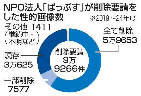 性被害を受けた人の支援をしているNPO法人「ぱっぷす」が、交流サイト(SNS)などに投稿された性的画像について、被害者に代わってサイト側に削除を要請したところ、全部または一部削除された件数が2019~24年度に計約6万7千件に上ったことが16日、分かった。同団体は「消えないと諦めないで相談してほしい」と呼びかけている。