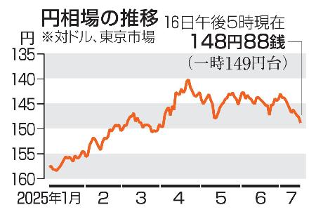 16日の東京外国為替市場の円相場は円安ドル高が進行し、一時1ドル=149円19銭を付けた。4月上旬以来、約3カ月ぶりの円安ドル高水準。参院選で与党の過半数確保が微妙な情勢と伝わり、野党が主張する財政拡張への懸念が強まって、円が売られてドルが買われた。米国でインフレが進むとの見方も円売りを後押しした。