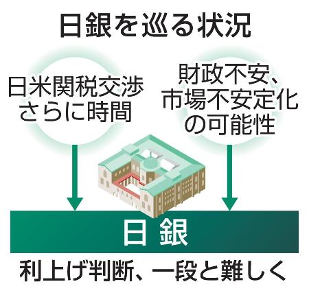 対米関税交渉を巡り赤沢亮正経済再生担当相は「選挙で勝ったとか負けたとかは基本的に関係ない」と強気の姿勢を崩していないが、市場では、石破政権が弱体化する中で米側から譲歩を引き出せるのかどうかを疑問視する声が上がる。野村証券の岡崎康平チーフマーケットエコノミストは「関税交渉の妥結時期や内容が見通しづらくなり、次回の利上げ時期は先送りを意識せざるを得ない」と指摘する。