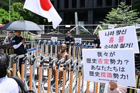 【ソウル共同】旧日本軍の従軍慰安婦問題を象徴するソウル中心部の少女像前で23日、韓国の右派団体が像の撤去などを主張する集会を行った。「少女像を守る」として、座り込んできた左派団体が最近撤収したことを受け決行。日本の国旗を掲げて君が代を流すなどし、付近は一時騒然とした。