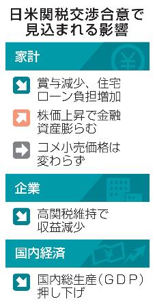 日米関税交渉の合意により米通商政策を巡る不透明感が後退し、株価はひとまず上昇した。一方、ある程度の高関税が維持されるため、企業収益や賞与が減り、新たに借り入れる住宅ローンの負担が増える恐れもある。米国産の加工用や飼料用のコメは輸入が増える見通しだが、高騰する主食用米の小売価格の引き下げにはつながらないようだ。