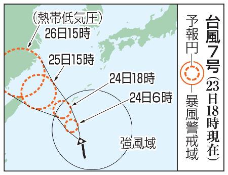 台風7号は23日午後9時現在、沖縄の南を時速約20キロで北西へ進んだ。中心気圧は994ヘクトパスカルで最大風速20メートル、最大瞬間風速30メートル。