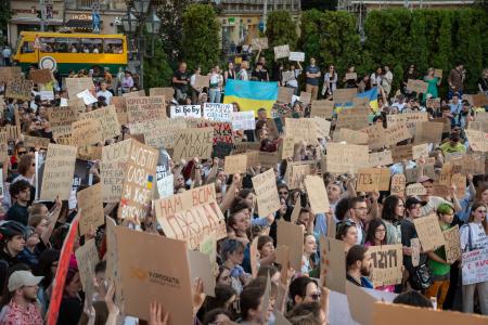 【キーウ共同】ウクライナで汚職捜査専門の2機関の権限を弱める法改正が実施されたことへの抗議活動が23日、国内各地で行われた。当局発表などによると首都キーウや東部ハルキウ、西部リビウなど20以上の都市で計1万人以上が参加。ロシアの侵攻後初の大規模デモとなり、戦時下で高支持率を誇るゼレンスキー政権の基盤が揺らぎかねない事態となった。
