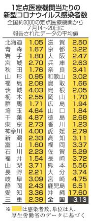 1機関当たりの感染者数が最も多かったのは沖縄の17・60人で、鹿児島6・51人、熊本5・56人と続いた。少なかったのは山形0・95人、北海道1・05人、香川1・23人などだった。