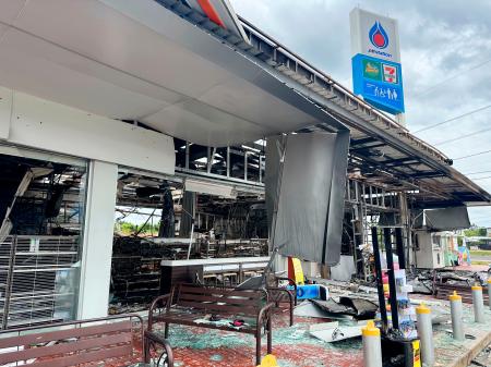 焼け焦げた商品棚に垂れ下がる天井パネル。シーサケート県ガンタララのコンビニは24日、ミサイル弾が直撃し、8歳の少年ら計8人が死亡した。25日に訪れるとガラスが粉々に砕け、損壊した車が放置されていた。「悲劇だ」。オーナーの男性は言葉少なに語った。