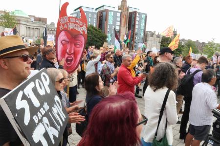 デモはスコットランドの中心都市エディンバラや、トランプ氏が所有するゴルフ場があるアバディーンで実施。アバディーンでは中心部の広場に「トランプを止めろ」「出て行くべきは移民ではなく、あなただ」と書いたプラカードやパレスチナの旗を掲げた数百人が集結。参加者の1人がマイクを握り「トランプ流の横暴さが世界に広まっている。英政府はなぜ反対をしないのか」と叫んだ。