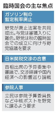参院選を受けた臨時国会は8月1日に召集される見通しだ。野党はガソリン税の暫定税率廃止法案を共同提出し、審議入りを求める。日米関税交渉を巡っては、合意内容の是非を追及する。衆院に加えて参院でも与党を少数に追い込んだ参院選の結果を受け、攻勢を強める構えだ。参院の委員長ポストを巡る駆け引きも激しくなりそうだ。
