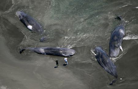 千葉県館山市の平砂浦海岸で29日夕、クジラ4頭が打ち上げられているのが見つかった。県安房土木事務所は、原因や30日の津波との関連は不明だとしている。一方、過去の大地震前にも同様の事例があったとして、クジラが何らかの影響を受けた可能性を指摘する専門家もいる。