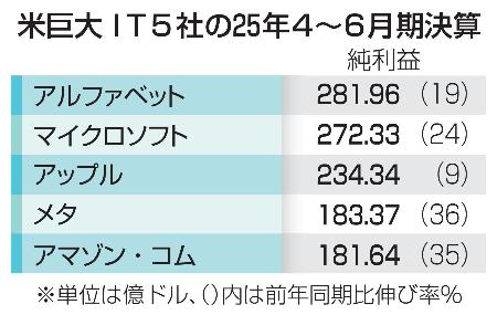【ニューヨーク共同】米巨大IT5社の2025年4~6月期決算が7月31日出そろった。生成AIの需要増を追い風にいずれも増収増益となった。