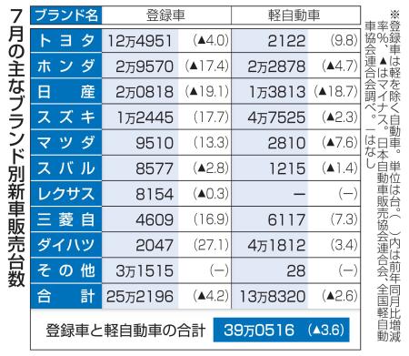 7月の国内新車販売台数は、前年同月比3・6%減の39万516台となり、7カ月ぶりに減少した。経営難でブランド力が低下した日産自動車の販売不振が響いた。日本自動車販売協会連合会と全国軽自動車協会連合会が1日発表した。