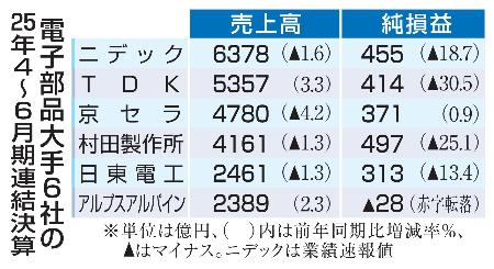 電子部品大手6社の2025年4~6月期連結決算(ニデックは速報値)が1日、出そろった。前年同期と比べ円高傾向だった影響で、売上高はニデックや村田製作所など4社が減収となった。純損益はTDKなど4社が減益だった。京セラは増益で、アルプスアルパインは赤字に転落した。