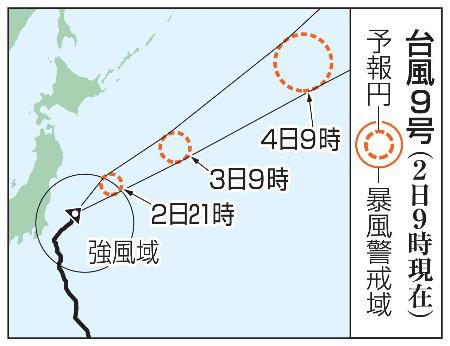 台風9号は2日午前9時現在、関東の東を時速約20キロで北東へ進んだ。中心気圧は975ヘクトパスカルで中心付近の最大風速25メートル、最大瞬間風速35メートル。