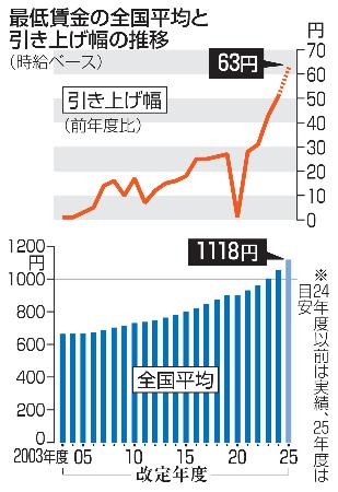政府は最低賃金の全国平均を「20年代に1500円」とする目標を掲げている。達成には25~29年度改定で毎回7・3%の引き上げが必要となる計算だ。25年度の小委員会は、各種経済指標だけで目安を判断するのではなく、政府目標を意識しながらの協議となった。