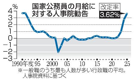 人事院は7日、2025年度の国家公務員給与を引き上げるよう国会と内閣に勧告した。最も人数が多い行政職は月給を平均3・62%(1万5014円)引き上げる。3%を超える増加は1991年度の3・71%以来、34年ぶり。民間の賃上げが進んだことに加え、人材確保のため、比較対象となる民間企業の規模を大きくしたことが要因だ。
