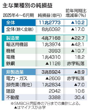 東京証券取引所に上場する企業の4~6月期決算発表が8日、ピークを迎えた。純利益の合計は前年同期比10・2%減で、4~6月期としては2022年以来、3年ぶりに減少する見通し。トランプ米政権の関税措置の影響で製造業全体が22・7%減と不振で、特に自動車を含む輸送用機器は42・1%減と打撃を被った。企業の業績予想などを基にした26年3月期の純利益予想は6年ぶりの減益を見込む。