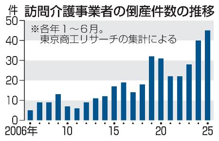 訪問介護事業者の倒産は2025年1~6月に全国で45件あり、2年連続で過去最多を更新したことが9日分かった。前年同期の40件から12・5%増で、介護報酬の減額が影響した。集計した東京商工リサーチは、物価高でコスト削減が難しいため、自力での経営改善は「限界」だとして公的支援を訴えている。